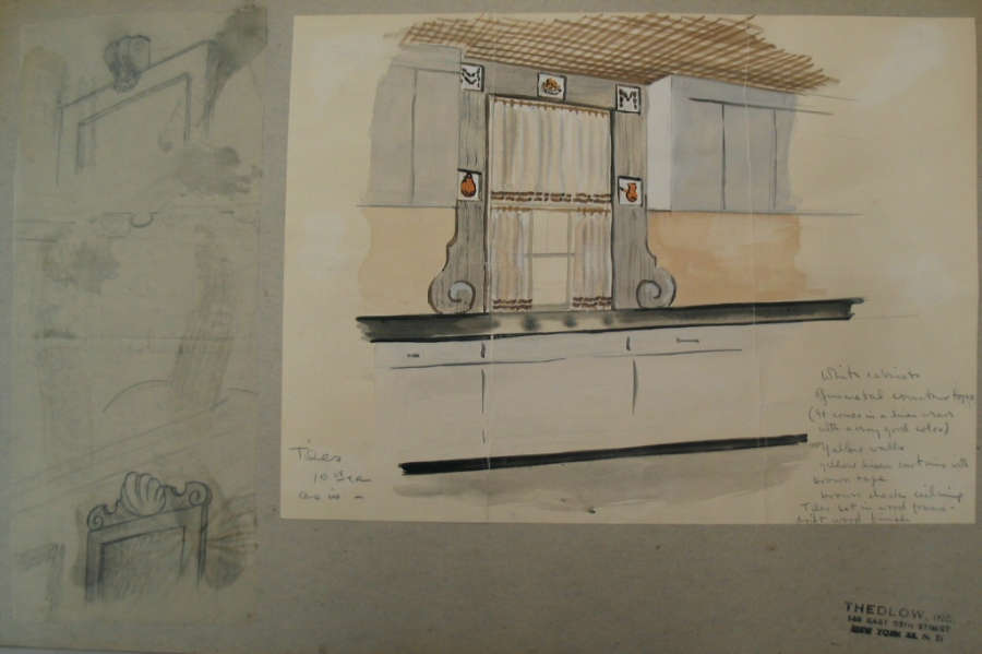 All on recto: On the right image in pencil script: "T(?)10.00 each as is- / White cabinets Gunmetal countertops (It cones in a linen (?) with a very good color) / Yellow walls / Yellow linen curtains with brown tape / brown check ceiling / Tiles set in wood frame-drift wood fininsh".