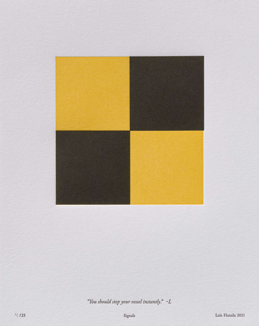 On recto, “4” inscribed in graphite LL within line printed in black ink at bottom that reads “/25 Signals Lois Harada 2021”