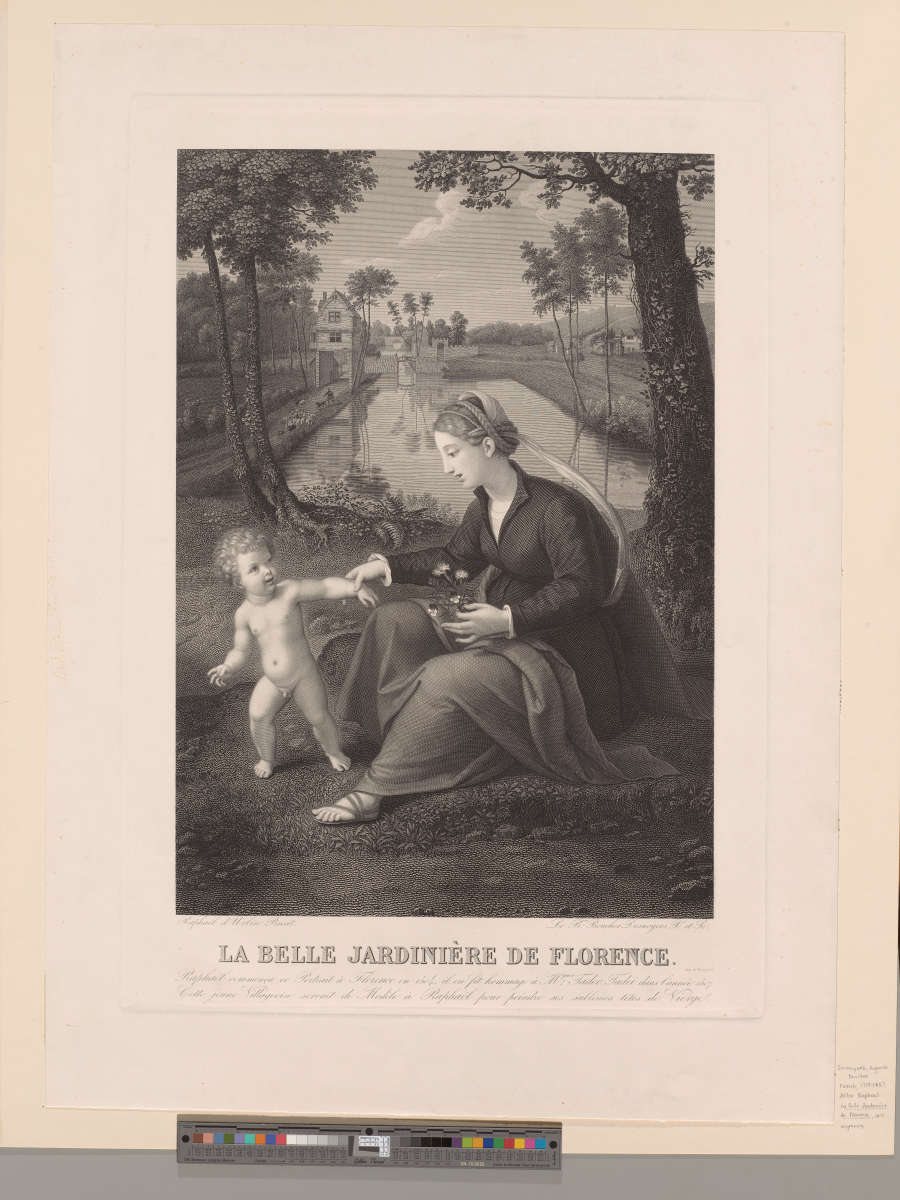 C: "LA BELLE JARDINIÈRE DE FLORENCE."; "Raphaël commença ce Portrait à Florence en 1504, il en fit hommage à M.gnor Tadeo Tadeï dans l'aneé 1507. Cette jeune Villageoise servait de Modéle à Raphaël pour peindre ses sublimes têtes de Vierge." Identification
