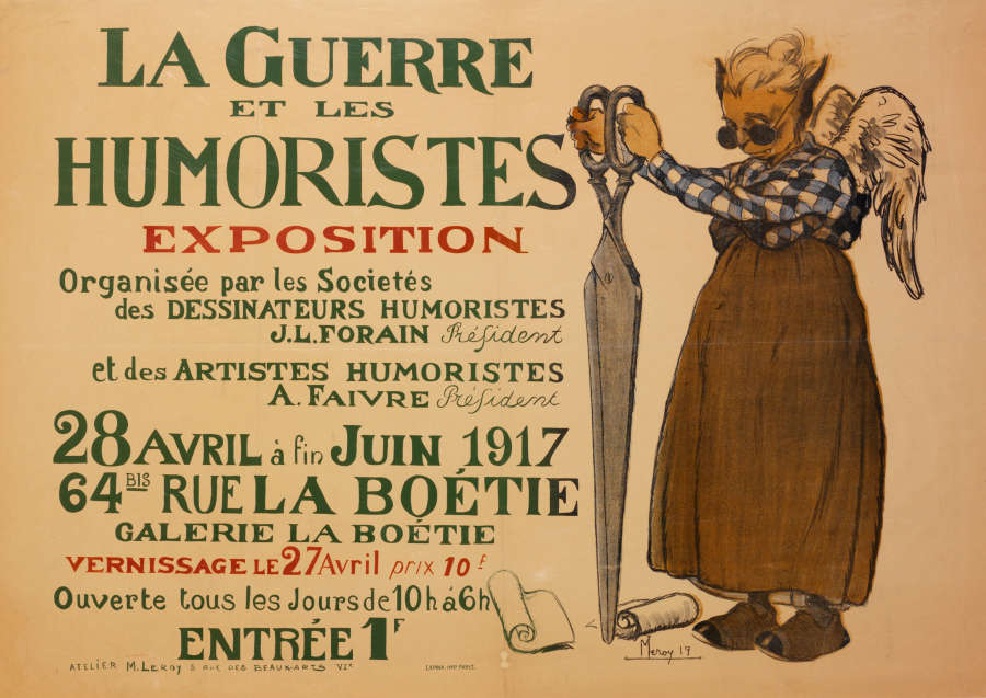 Signed and dated in stone in LR corner: "M Leroy 17"; printer's name printed L margin:"LAPINA. IMP. PARIS."; title printed in UL quadrant: "LA GUERRE/ ET LES/ HUMORISTES"; inscribed beneath title: "EXPOSITION/Organisée par les Societés/ de DESSINATEURS HUMORISTES/ J. L. FORAIN President/ et des ARTISTES HUMORISTES/ A. FAIVRE President/28 AVRIL â fin JUIN, 1917/ 64 BIS RUE LA BOÉTIE/ GALERIE LA BOÉTE/ VERNISSAGE LE 27 AVRIL prix 10 f/ Ouverte tous les Jours de 10 h á 6h/ ENTRÉE 1 F"; inscribed in LL margin: "ATELIERM. LEROY 5 RUE DES BEAUX-ARIS VI e."