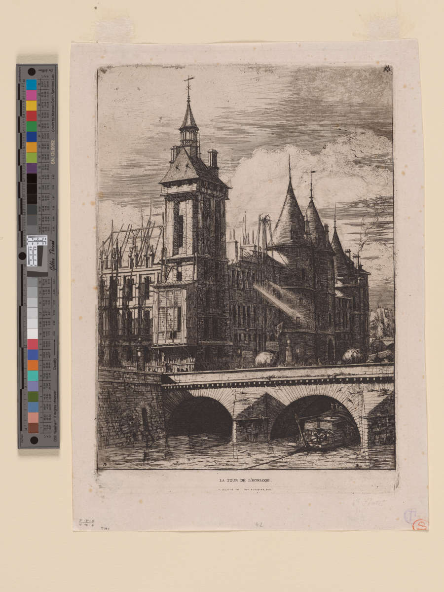Original--Recto:in pencil, LL:r.r.o/y.y.o THI; in LC:42Verso:in pencil, LL: D.28; in LR:GKKK/C·EKKK; in LRcorner:1/HD 3-96/ 1D In Plate--Artist's monogram in UR; titled and inscribed, LC:LA TOUR DE L'HORLOGE./ A.DELATRE IMP. RUE S JACQUES, 265; numbered, LL:5