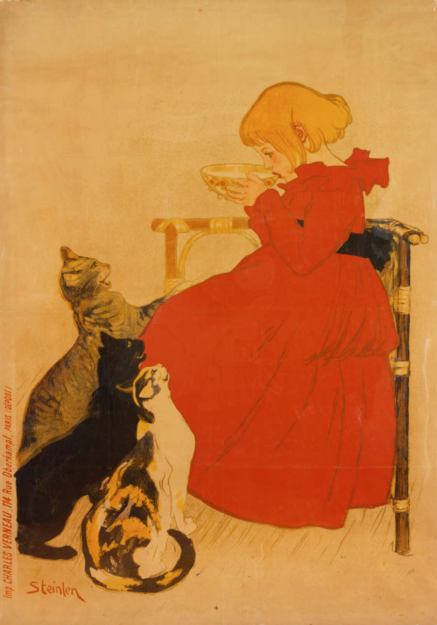 Signed in stone LL corner: "Steinlen"; printer's name in LL margin: "Imp. CHARLES VERNEAU. 114 Rue Oberkampf, PARIS (DÉPOSÉ)" partially legible text in UR corner and LR corner.