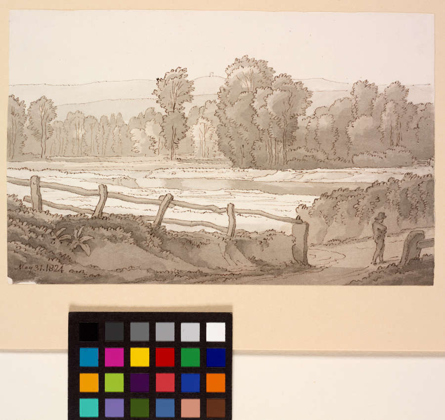 Dated, LL in brown ink:May 31, 1824 In pen on Fine Art Society label:Landscape and River Scene John White Abbott (1763-1851) - July, 1955 Fine Art Society, from whom purchased 1955.Possibly related image:(24)Trees by a Lake7" x 9¾"