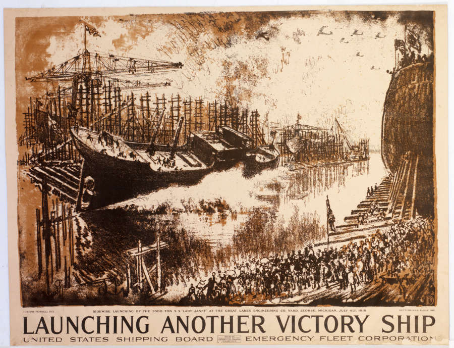 Artist name printed in LL corner: "IOSEPH PENNELL DEL."; printed in lower middle margin: "SIDEWISE LAUNCHING OF THE 3500-TON S.S. "LADY JANET" AT THE GREAT LAKES ENGINEERING CO. YARD, ECORSE, MICHIGAN, JULY 4th, 1918"; printer name printed in LR corner: "KETTERLINUS PHILA. IMP."; title printed on bottom edge: "LAUNCHING ANOTHER VICTORY SHIP/ UNITED STATES SHIPPING BOARD EMERGENCY FLEET CORPORATION"; printed in rectangular box at bottom middle: "ISSUED BY / PUBLICATIONS SECTION / EMERGENCY FLEET CORPORATION / PHILADELPHIA, P.A."