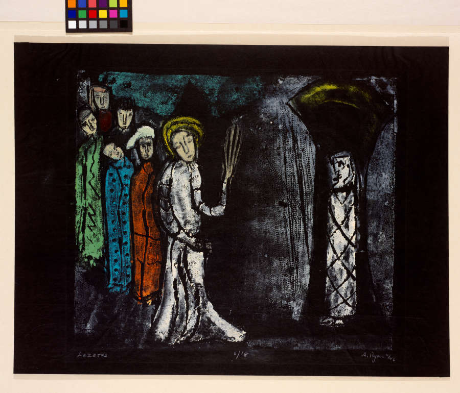 Inscribed in pencil, LL corner: "16 1/2 x 14 1/2" ; below image, LL: "Lazarus" ; LC: "6/18" ; LR: "A. Ryan 4/46"
