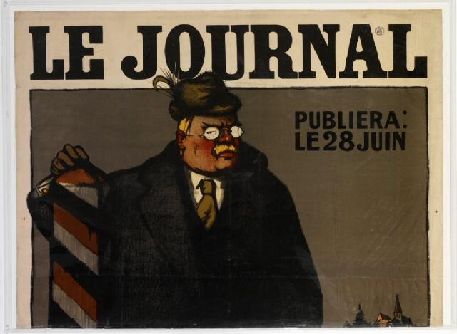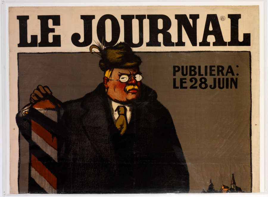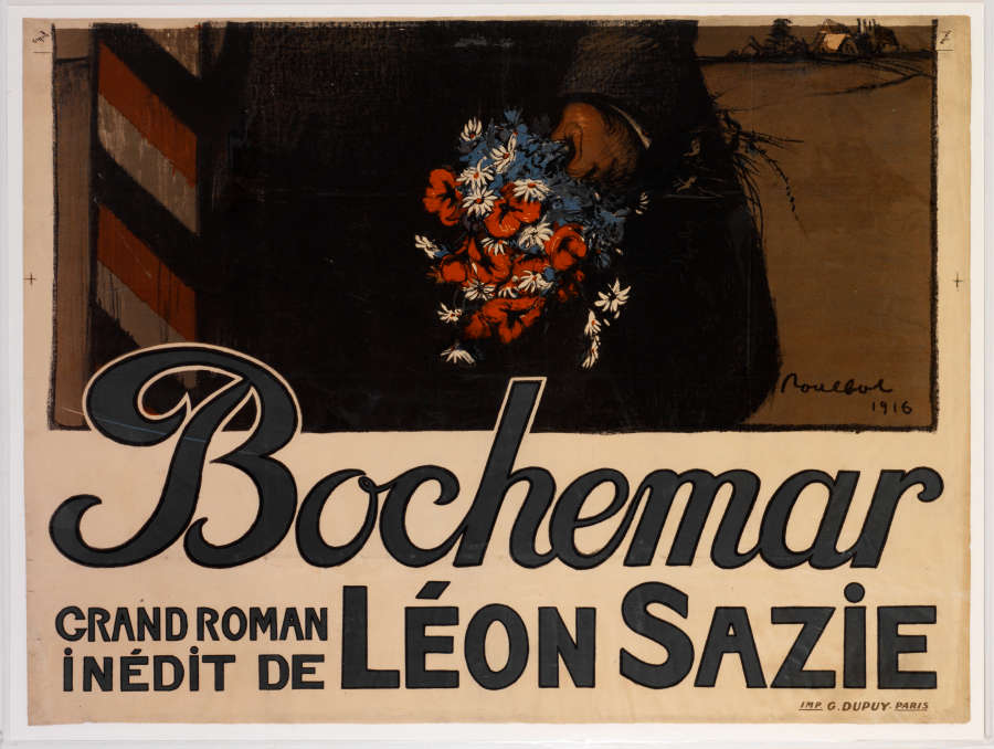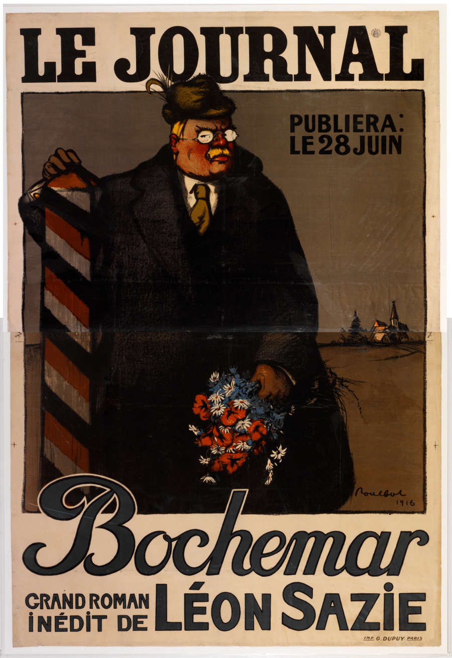 Signed and dated at bottom R: "Poulbot / 1916"; title printed on top edge: "LE JOURNAL"; inscribed in top R of image: "PUBLIERA: / LE 28 JUIN"; printed in lower quadrant: "Bochemar / GRAND ROMAN / INÉDIT DE LÉON SAZIE"; printer name inscribed in LR corner: "IMP. G. DUPUY. PARIS"; inscribed backwards on UL and UR corners of sheet B (bottom portion of poster): "Collage"