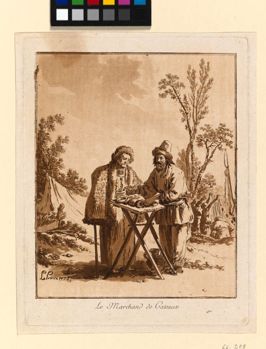 Original--Verso:inscribed in pencil in center:1In Plate--Signed and dated in LL:Le Prince 1772; titled in LC:Le Marchand de Gateaux.