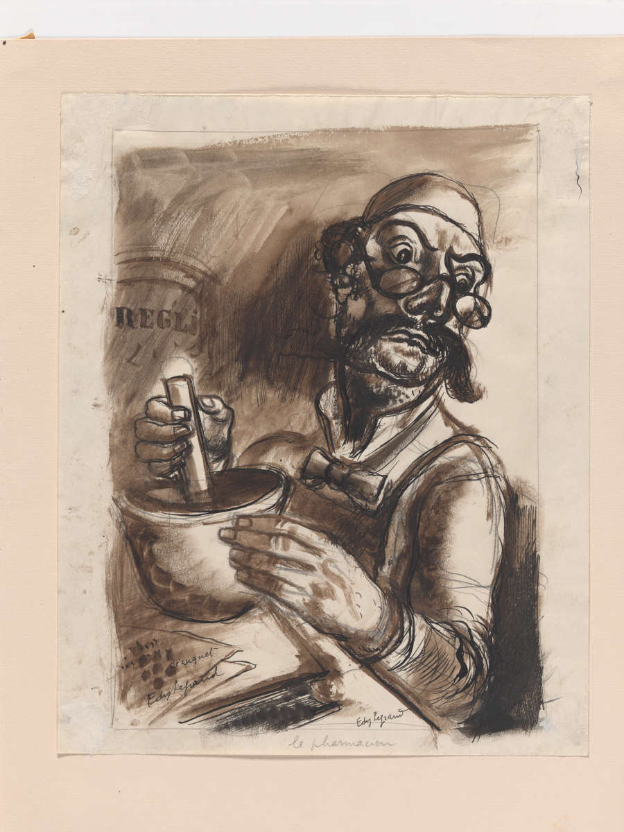 Signed and inscribed in ink lower portion:Bezuguet Edy Legrand ; LR: Edy Legrand In pencil, lower edge:le pharmacieur