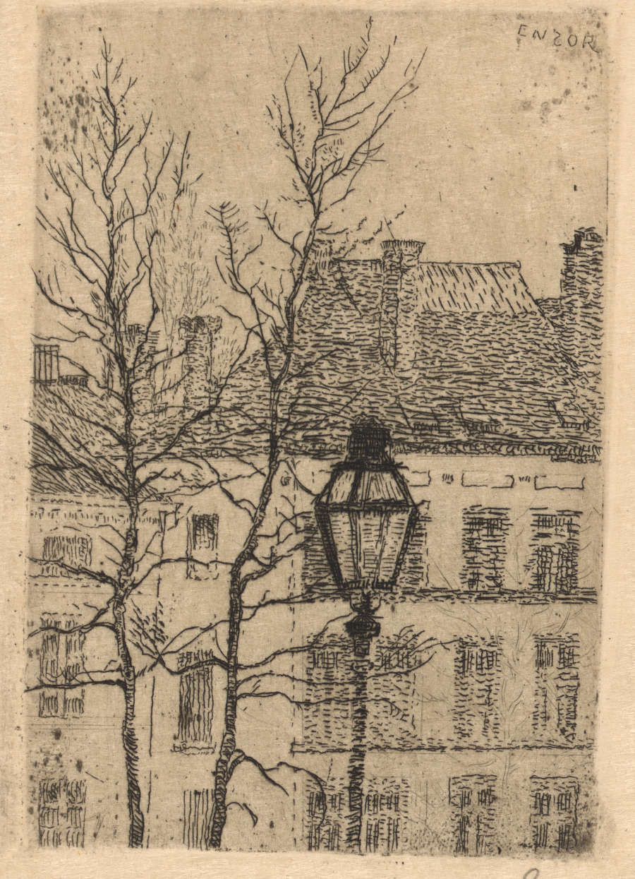 Original--Recto:dated and signed in pencil in LR:Ensor1896 Verso:in pencil in UR217(crossed out)/271; in center: ensor; in LL:Le reverbère/21; in LR:IGXIn Plate--signed in LR:Ensor (S is reversed)