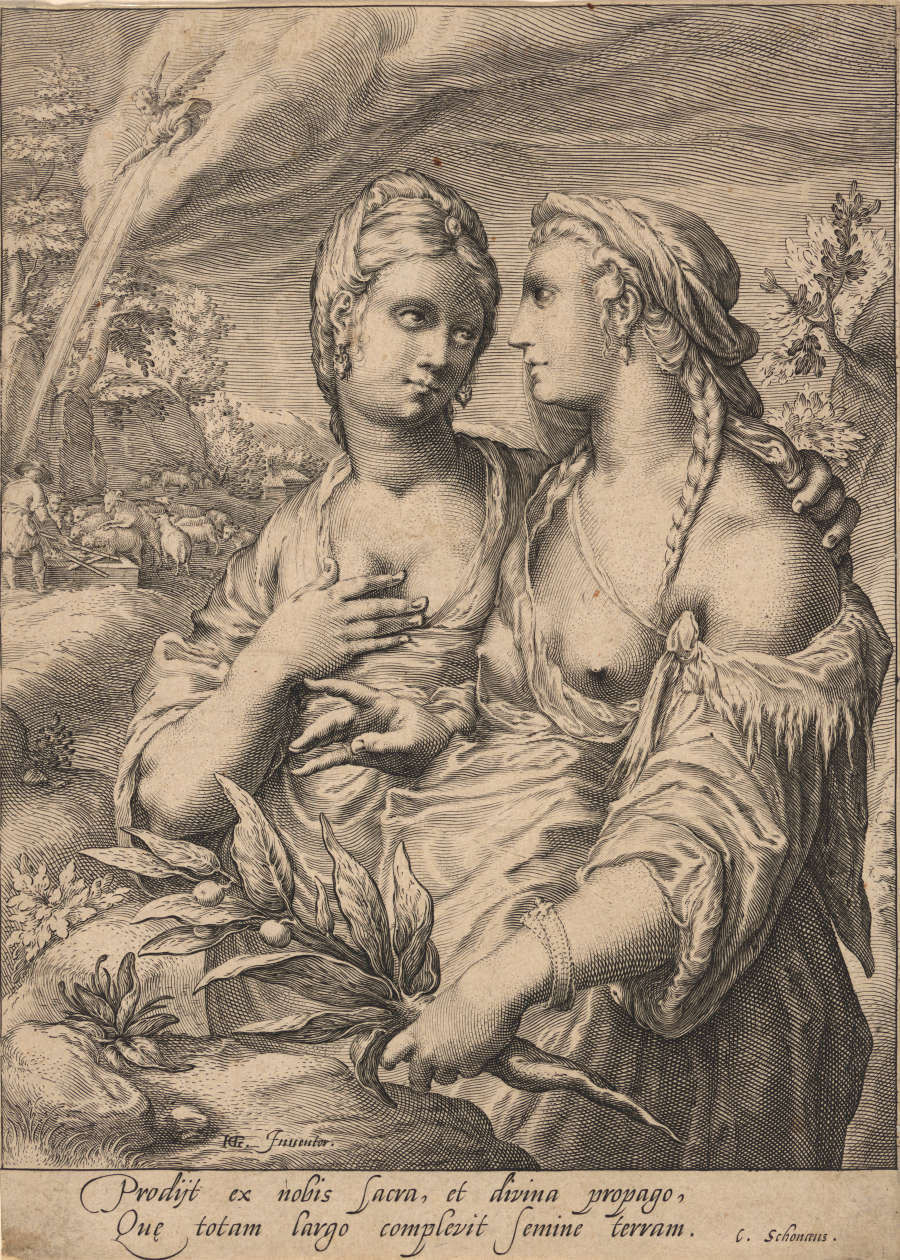 Verso:inscribed in pencil in UC:U7IN Plate--inscribed in LL:HG. Inventer.; inscribed in LC:Prodijit ex nobis Sarra, et divina propago,/Que totam largo complevit Semine terram. C. Schonaeus