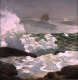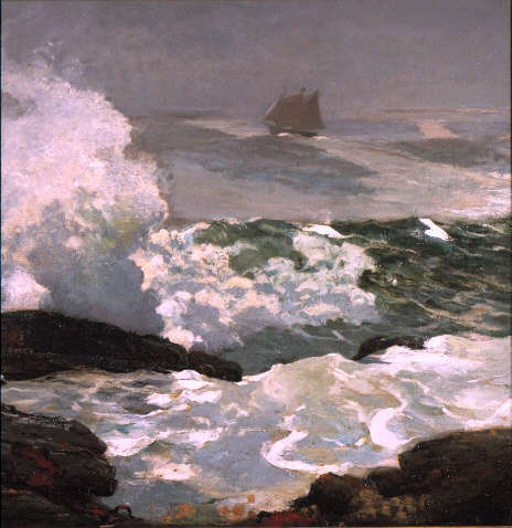 Homer’s view of the crashing Atlantic surf and a sailing ship “on a lee shore” address the dark reality of the ocean’s dominating presence. Leeward winds blow towards the coastline. A craft that cannot alter its course to windward is at risk of being run aground or dashed upon the rocky coast. The painting’s somber palette, broad, aggressive brushstrokes, and dramatically contained square format are combined to express man’s vulnerability in the face of nature.