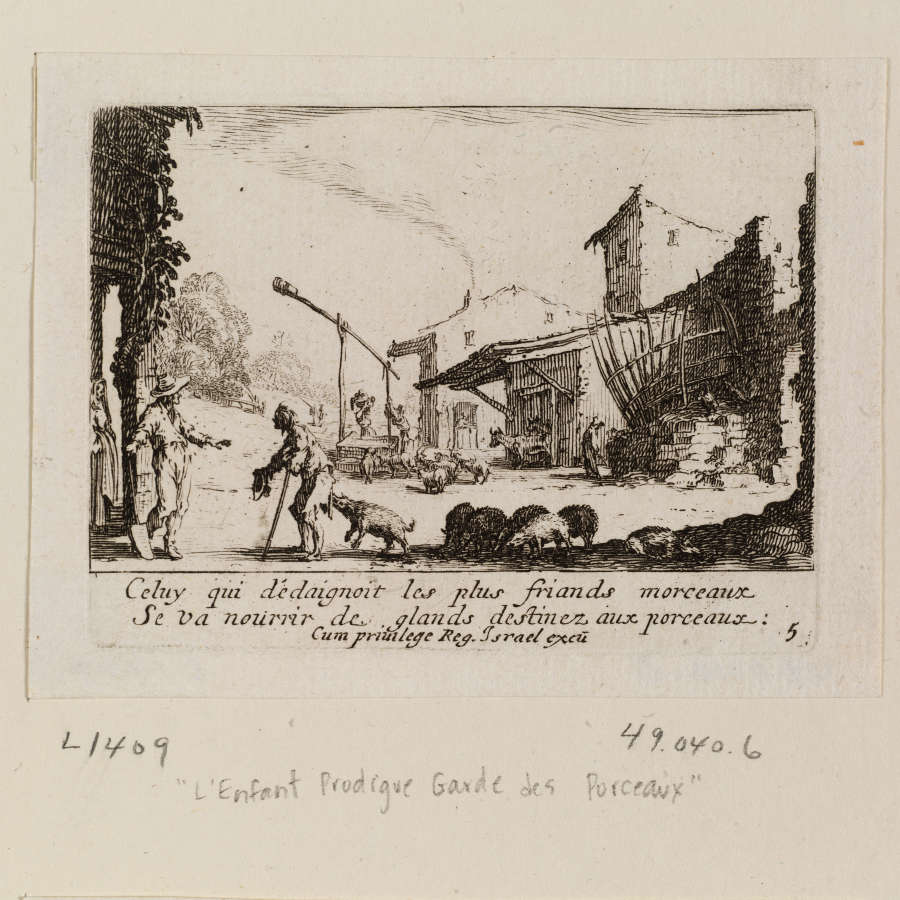 Original--Verso:in pencil, LR:L1409 In Plate--Numbered, LR:5; inscribed, LC:Celuy qui dédaignoit les plus friands morceaux/ Se va nourrir de glands destinez aux porceaux:/cum priuilege Reg. Israel excù