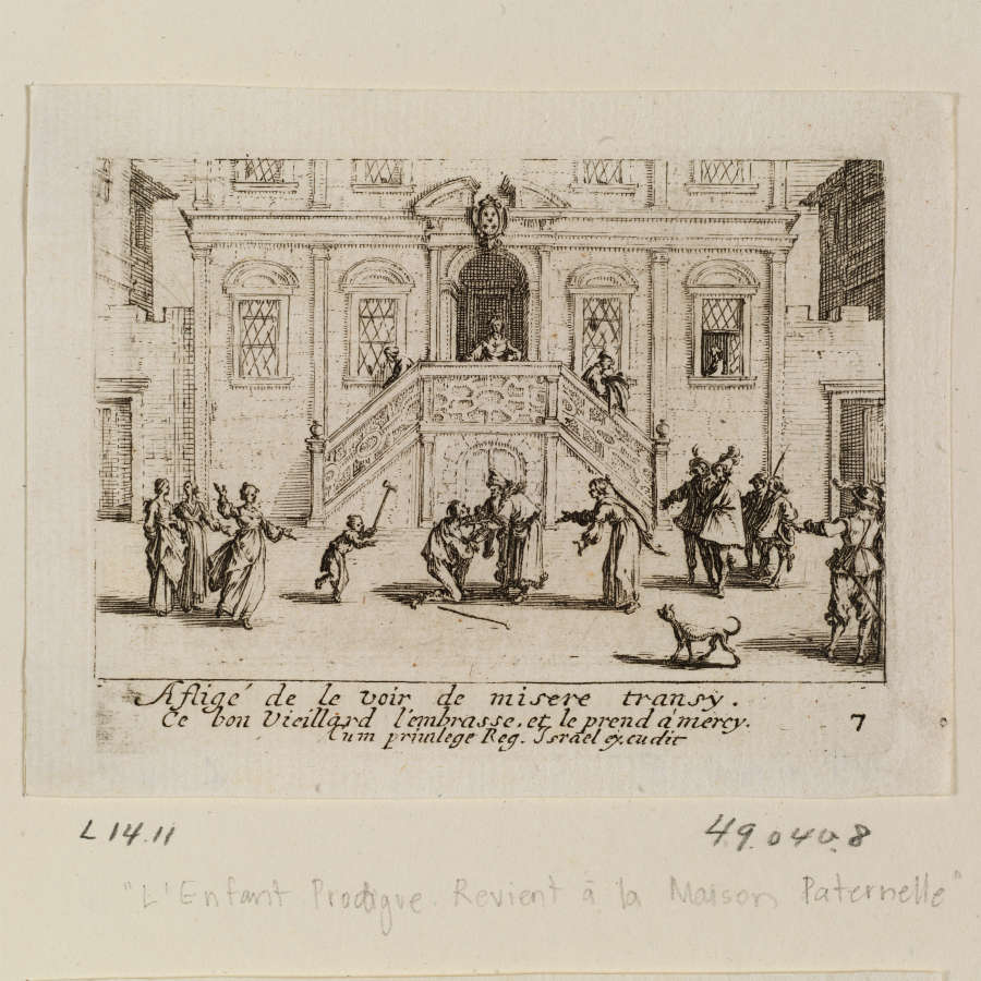 Original--Verso:in pencil, LR:L1411 In Plate--Numbered, LR: 7; inscribed, LC:Afligé de le voir de misere transy./ce bon Vieillard l'embrasse, et le prend à mercy./cum priuilege Reg. Israel excudit