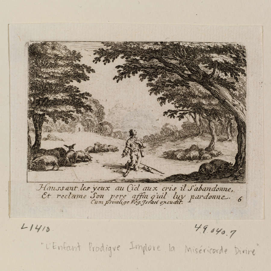 Original--Verso:in pencil, LR:L1410 In Plate--Numbered, LR:6; inscribed, LC:Haussant les yeux au Ciel aux cris il s'abondonne,/Et reclame son pere affin q'uil (sic)luy pardonne./cum priuilege Reg. Israel excudit.