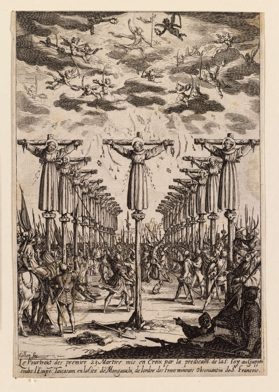 Original--Verso:in brown ink, UC:P. Mariette 1667; in pencil, UR:72In Plate--Signed, LL:Callot fec.; in LC:Le Pourtraict des premier 23 Martire mis en Croix par la predicaon. de las. foy au Giappon/soubs L'Empe. Taicosam en la Cité de Monga Sachi, de lordre des freres mineurs Obseruantin de. S. Francois.