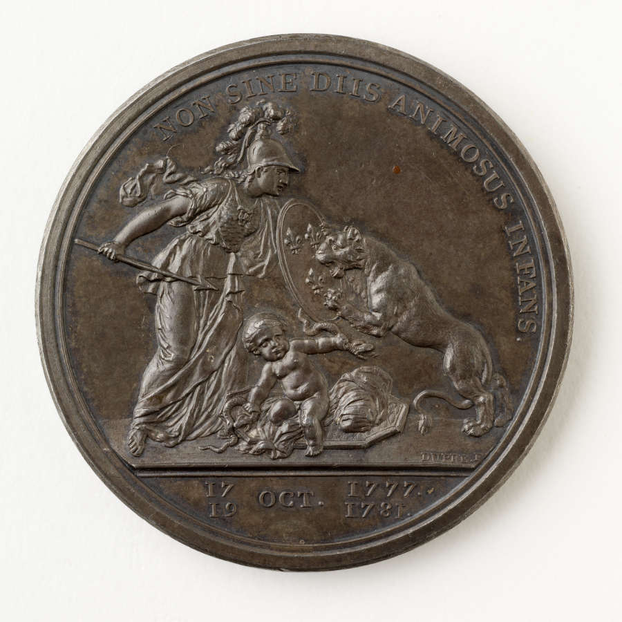 Recto: The words "Libertas" and "Americana"above woman's head;under a horizontal line below her "4 Juil.1776"; and under her neck the sculptor's name "Dupre" Verso: the words "NON SINE DIIS ANIMOSUS INFANS" above this scene; under the horizontal bar below the scene the dates engraved as follows "17/19 Oct. 1777/1781"; and on the right just above the horizontal bar, the sculptor's name "Dupre" followed by "F" for fecit.