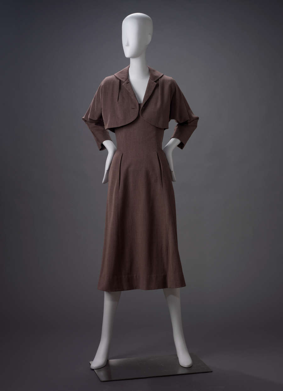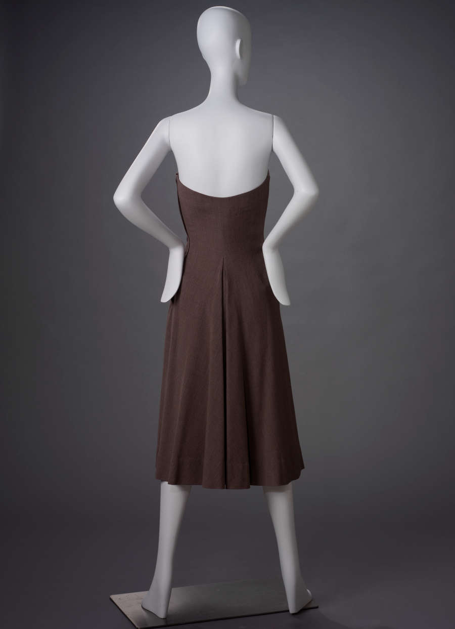 Light brown wool strapless dress with coordinate jacket, ca. 1950