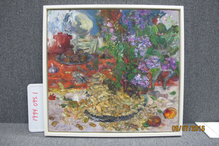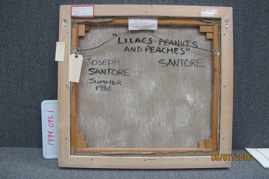 Signature: Signed on verso:Joseph Santore Summer 1986 Lilacs Peanuts and PeachesSantore