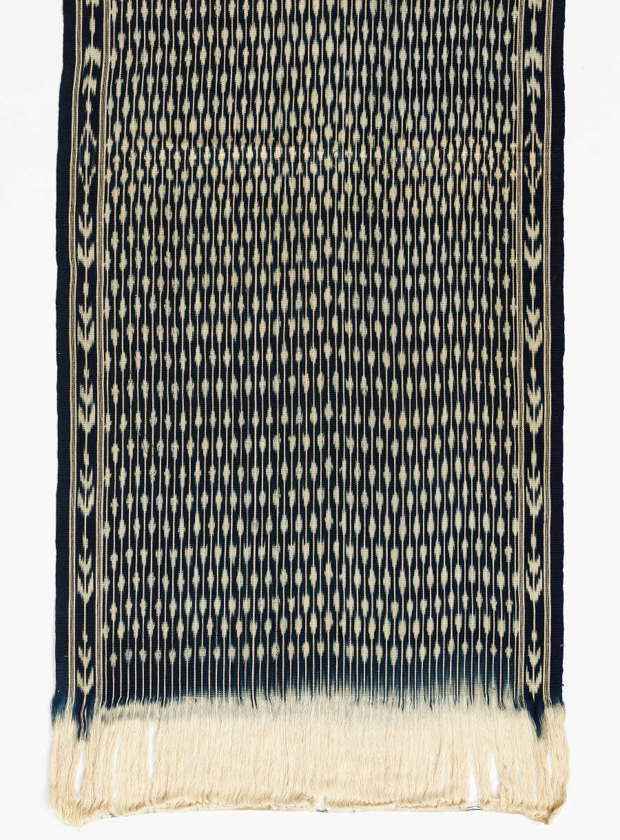 Plain weave cotton, ikat dyed with natural indigo; backstrap loom woven