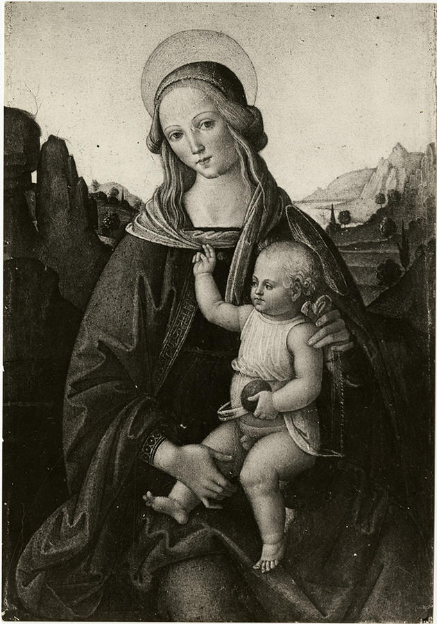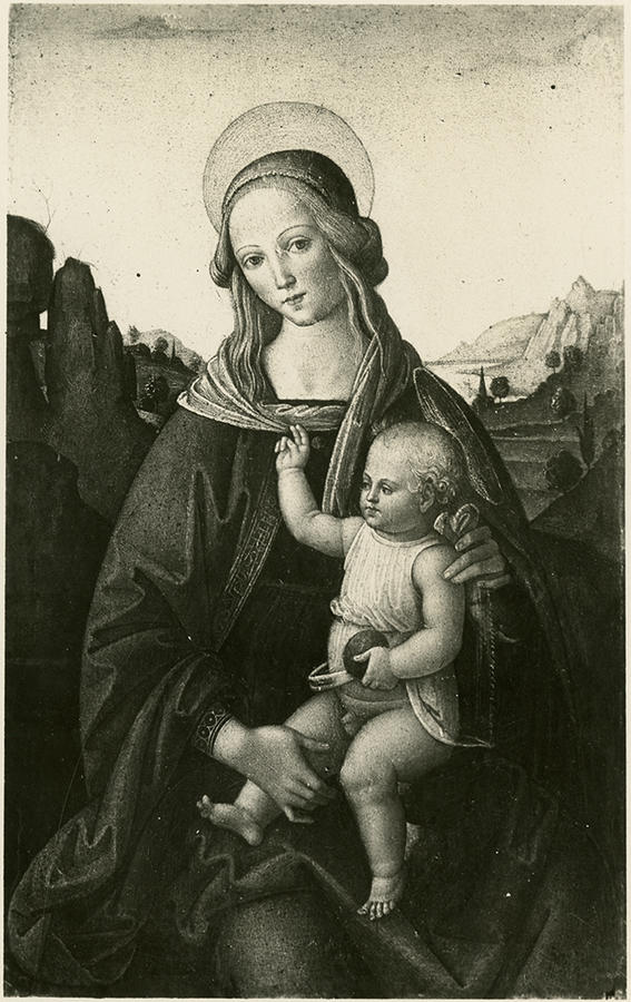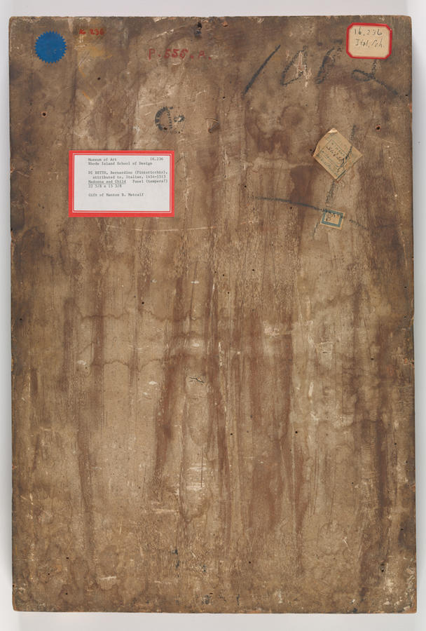 Purchased by Manton B. Metcalf for the Museum of Art, Rhode Island School of Design, at American Art Galleries, NY, sale "Art Treasures and Antiquities from the Famous Davanzati Palace," November 21-27, 1916. It appears in the sale catalogue, no. 1002, Bernardino di Betto (Pinturicchio), Madonna and Child, not illustrated. 1916.