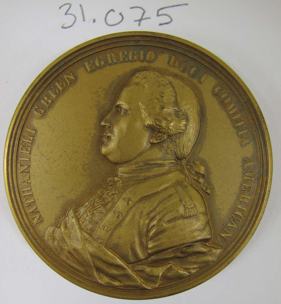 Obv: NATHANIEL I GREEN EGREGIO DUCI COMITIA AMERICANA.Rev: SALUS REGIONUM, HOSTIBUS AD EUTAW DEBELLATIS DIE VIII SEPT MDCCIXXXI.