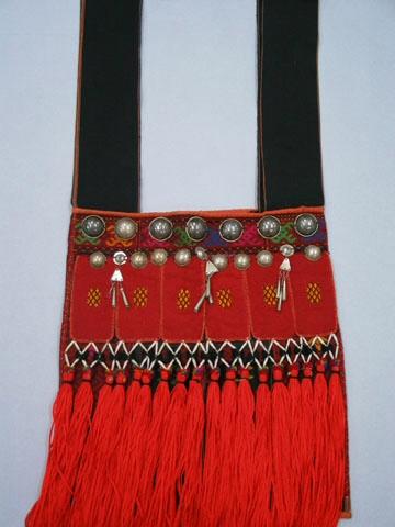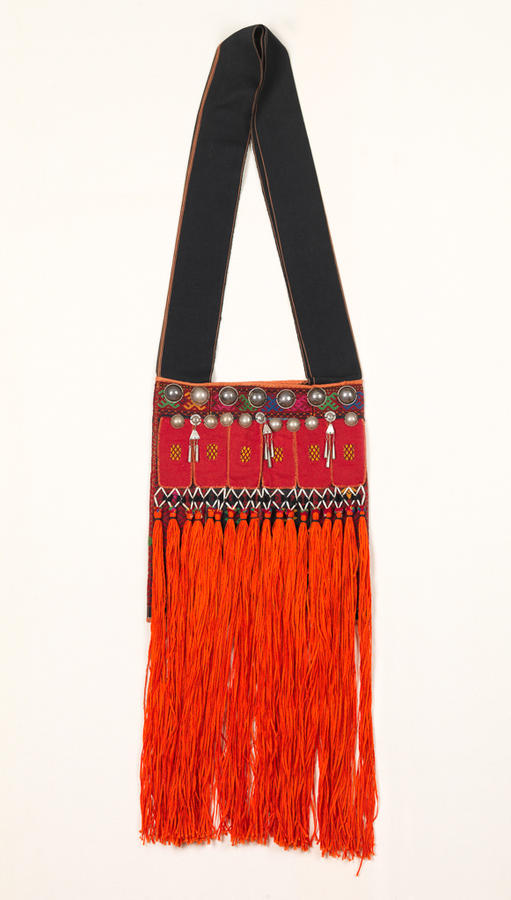 Cotton, wool, seed, silver disks, tassels; plain weave with supplementary weft patterning and appliqué