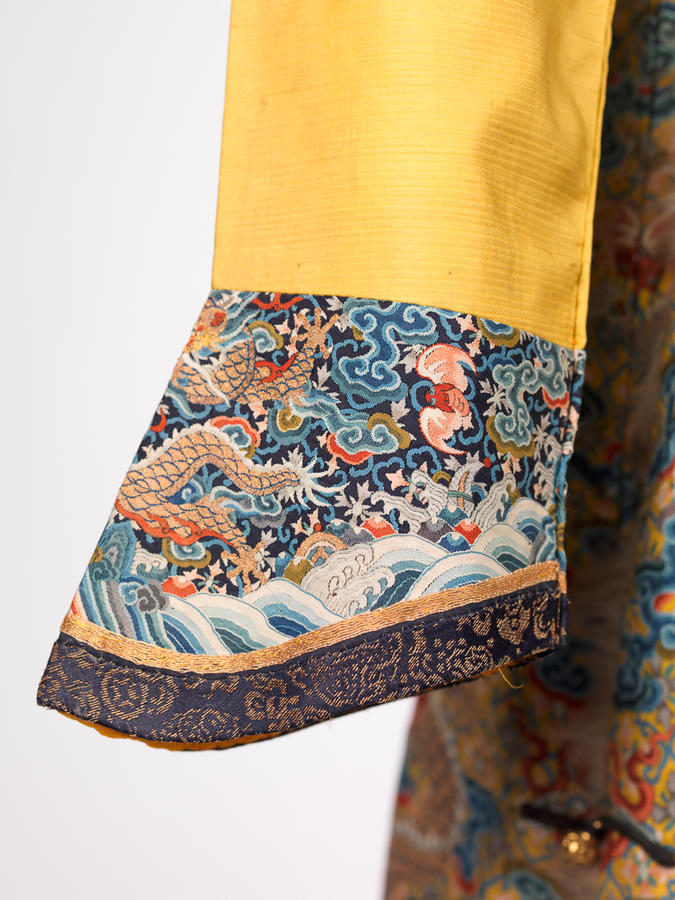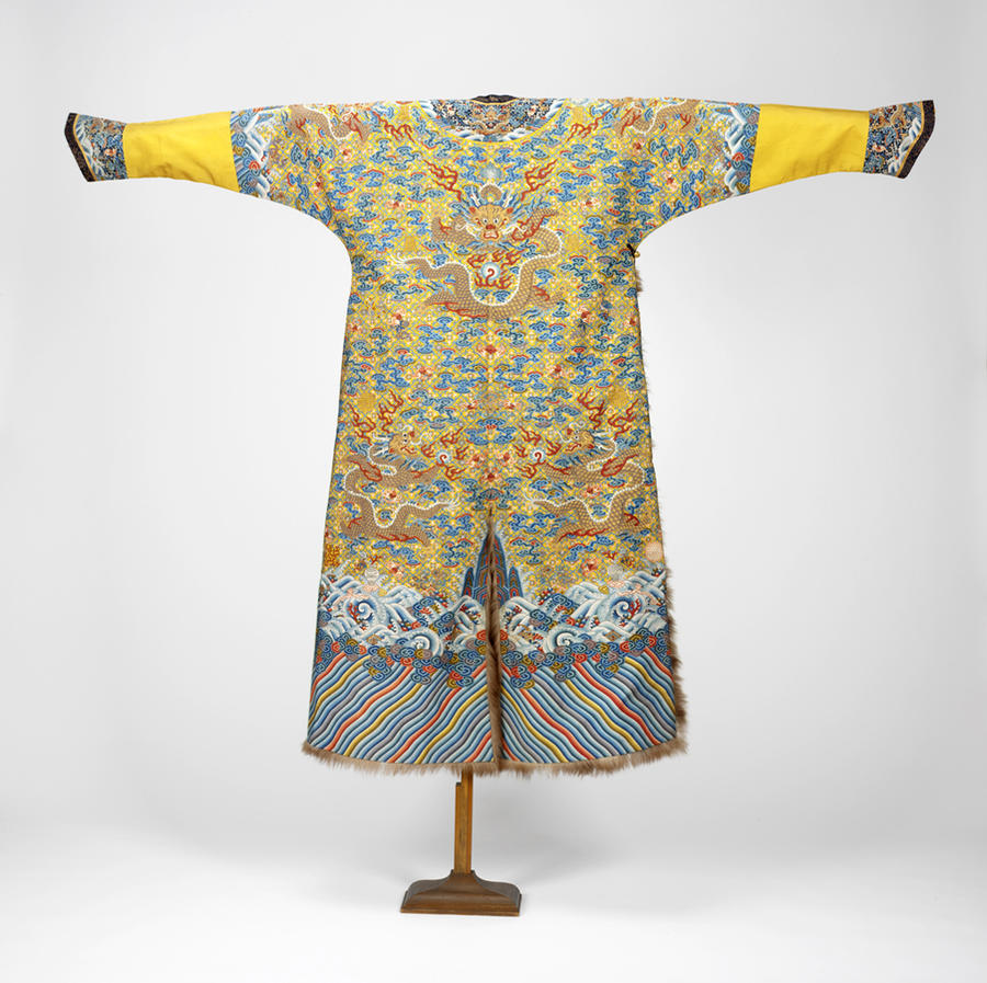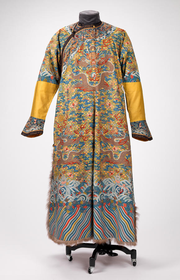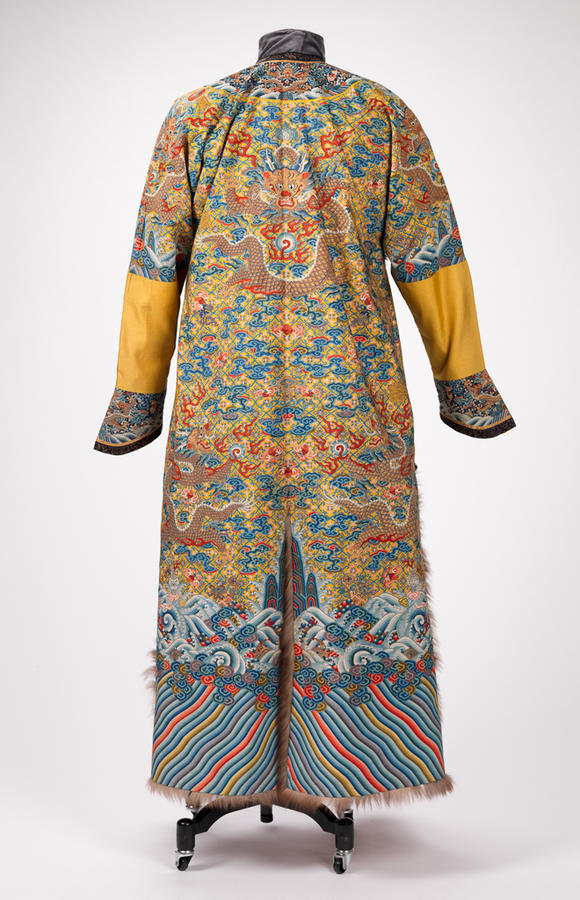 Silk and gold-wrapped thread slit-tapestry weave (kesi) with fur trim