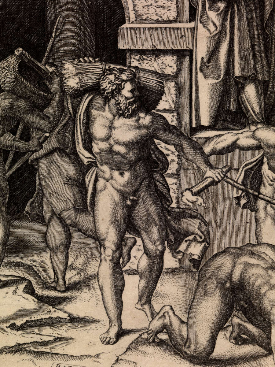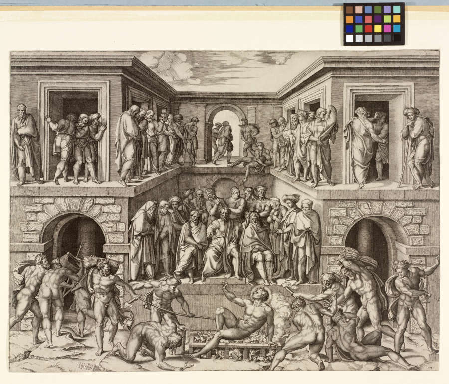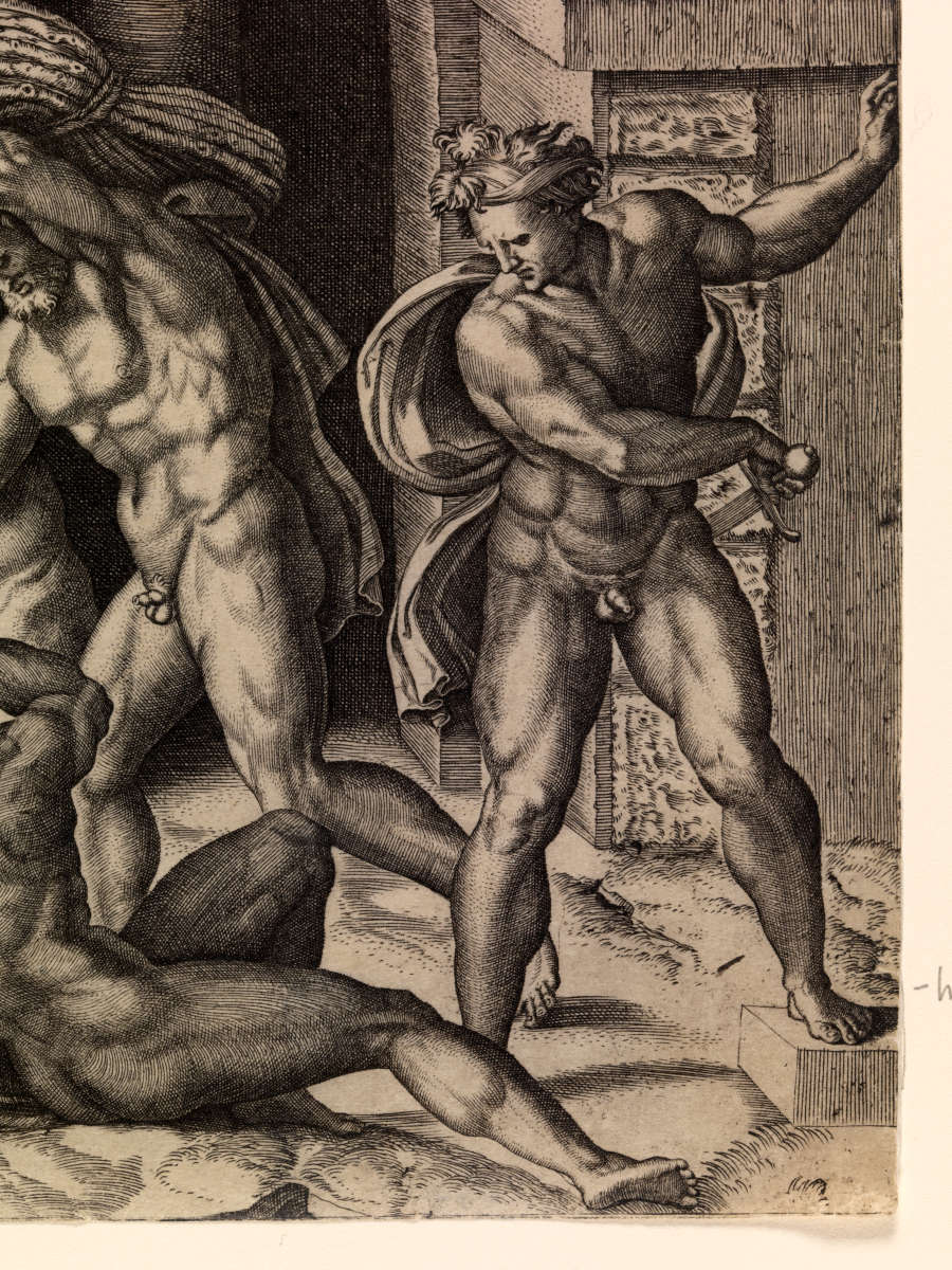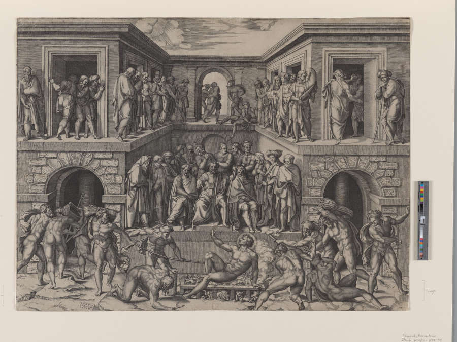 Lettered LL, within image with Marcantonio's monogram "MAF" and "Baccius / Brandin. /Inven."