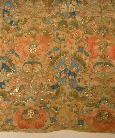 Cotton, silk, metallic yarns; plain weave, embroidery (double running stitch, satin stitch)