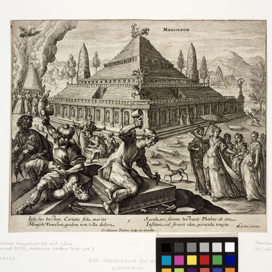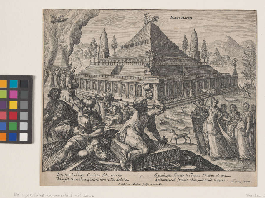 Printed, on image, UR: Mausoleum; Printed, on print, LC: Crispianus Pabaeus sculp: et excudit; Printed, on print, LR: M:d: Vos jnvent; Printed, on print, LL to LR: Ipsa suo bustum... miraculs tempus