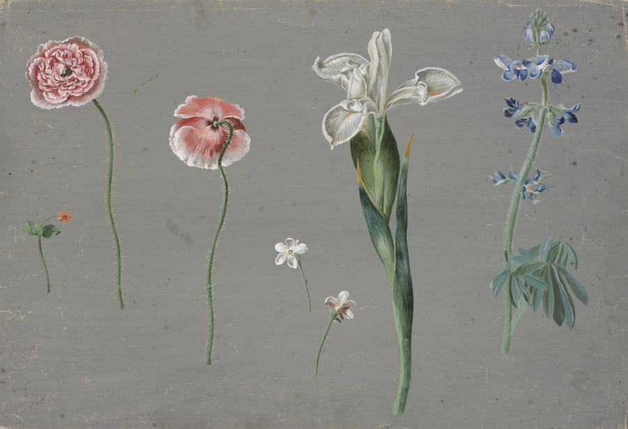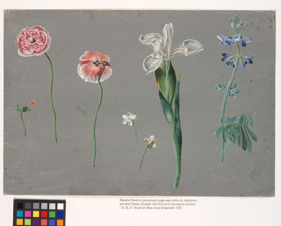 Meadow flowers on grey ground, poppy seed, white iris, delphinium and small flowers