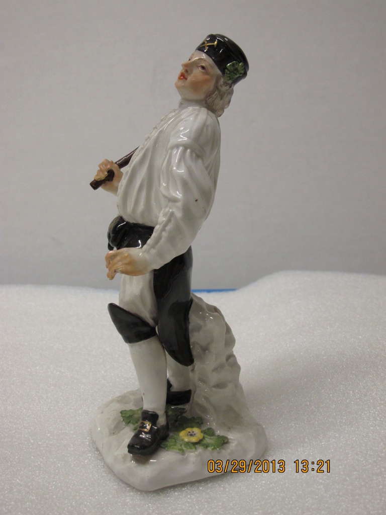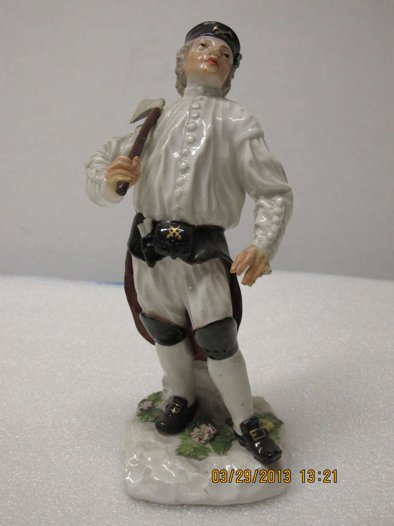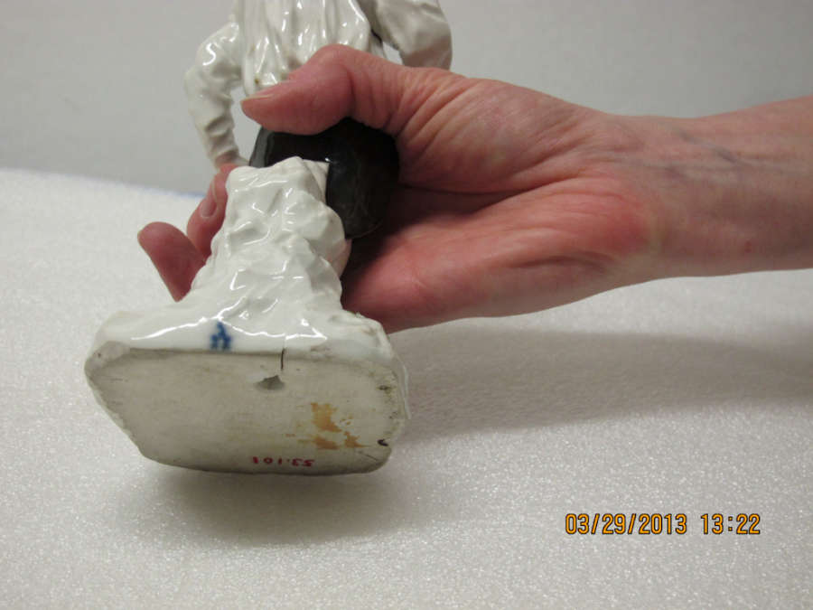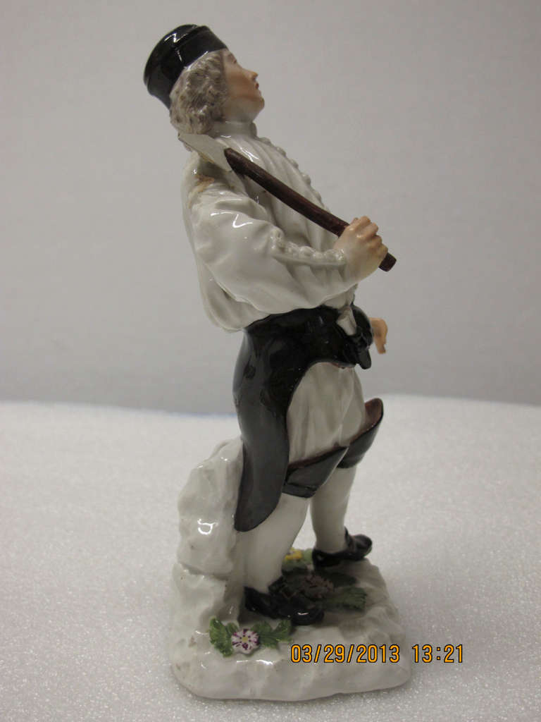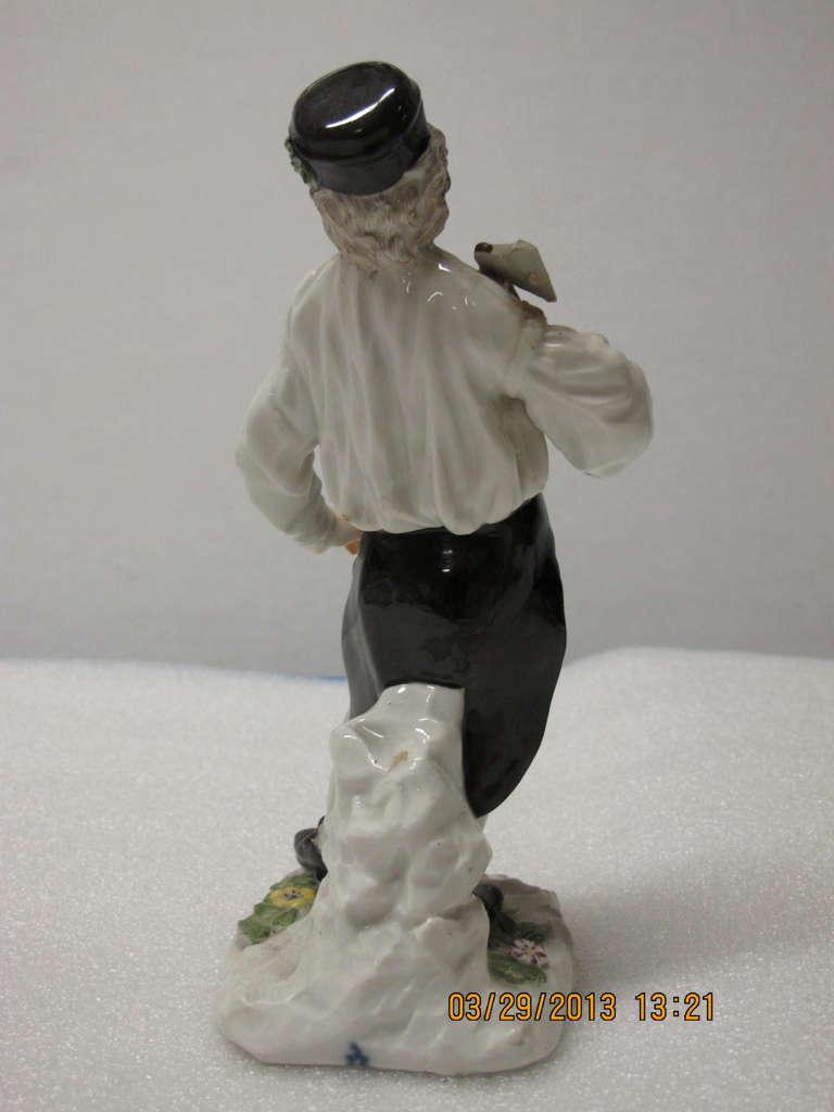 Marks: Single hole and fire crack in bottom of unglazed base; crossed swords mark in underglaze blue at back of base.