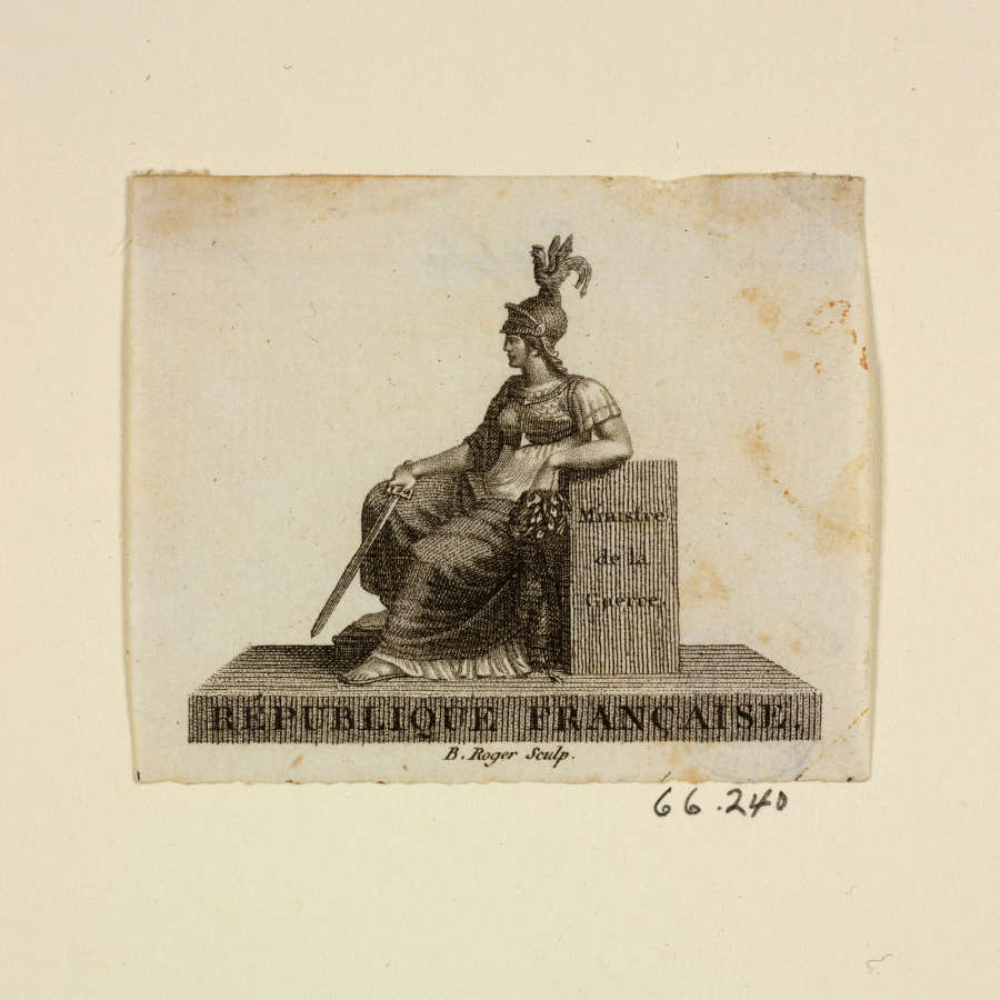In Plate--Verso:in pencil in UR:2y6hIn Plate--In block on which figure leans:Ministre/de la/Guerre; in LC:RÉPUBLIQUE FRANÇAISE./B. Roger sculp..