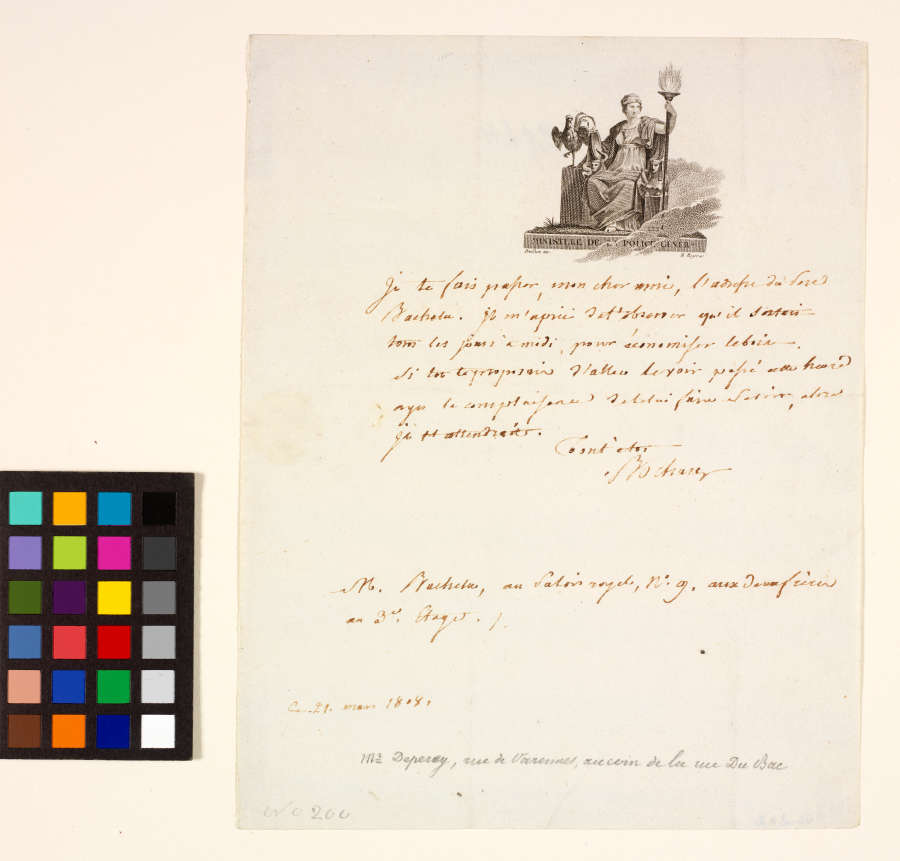 Original--Recto:in brown ink below image:(11 line letter, see print for full inscription)In pencil in LC:Mr Deperey, rue de Varennes, au coin de la rue Du Bac; in LL:No 200 Verso:In pencil in UC:2964In Plate--Titled in LC:MINISTERE DE LA POLICE GENER LE; In LL:Prudhon inv.; in LR:B. Roger sc.