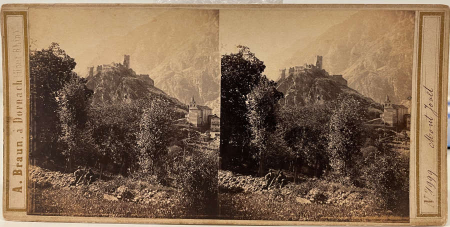 Printed on card, recto left margin: A. Braun, à Dornach (Haut Rhin). Printed on card, recto right margin: No._____. Inscribed in ink, on card, recto right margin: 1999 Mont Jouet. Inscribed in graphite on verso, upper right: Savoya [?] RE/ $4.60. Small sticker with printed text (oriented upside down) adhered to verso, lower left: J FRIES OTTICO/ DI/ S. M. IL RE D'ITALIA/ TORINO-GENOVA-MILANO. Inscribed, in ink, on recto (oriented upside down): 5.68
