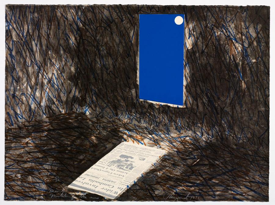 Signed Rosenquist and dated 1971 at lower right center, numbered 51/70 and titled Moonbeam "Mistaken for the News" at lower left canter: pinwheel blindstamp