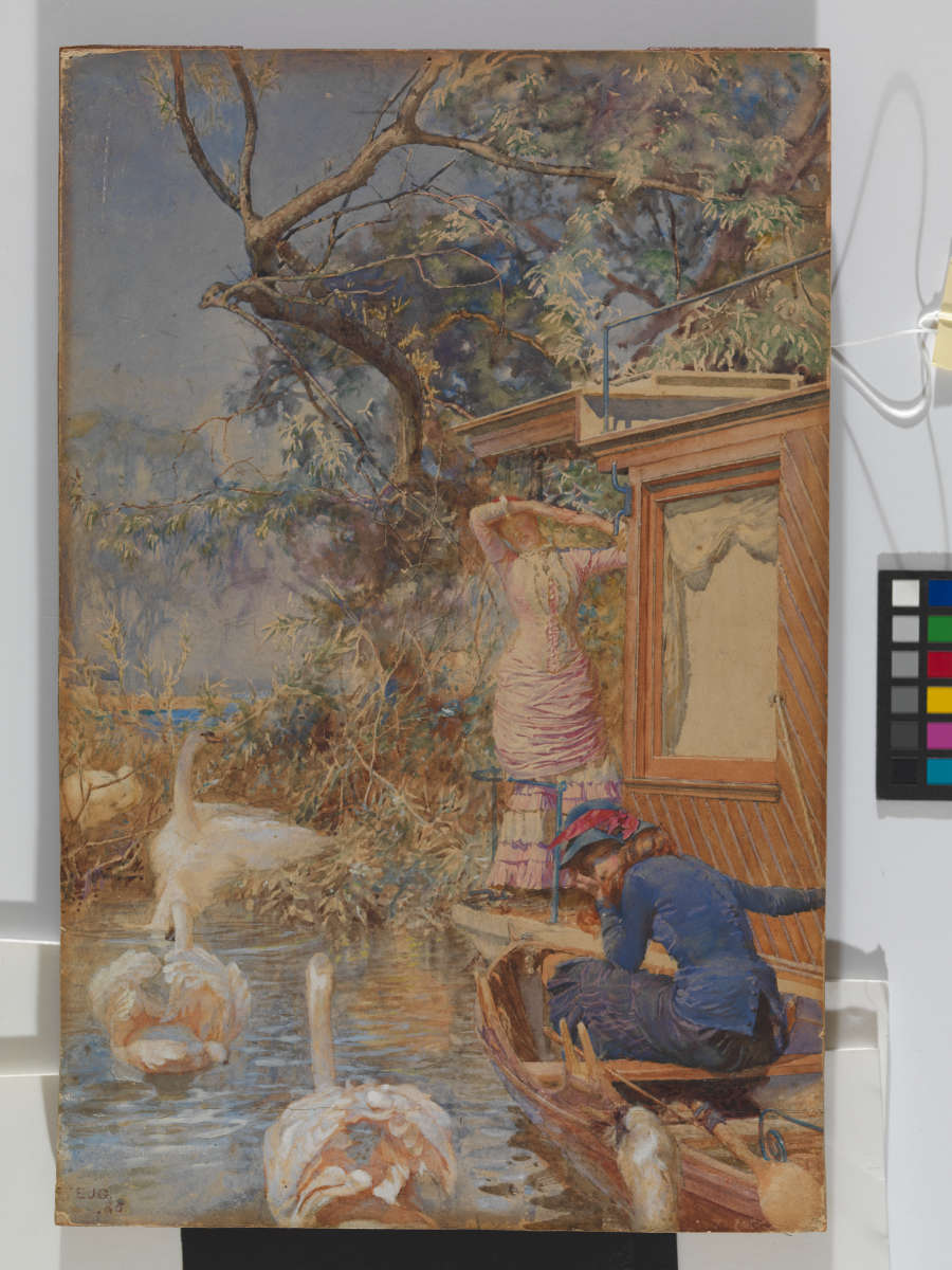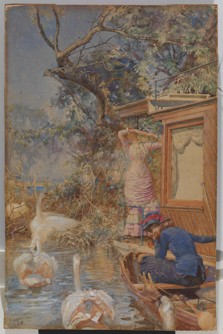 Inscribed in watercolor or gouache, recto LL: EJG. Labels on verso of frame, UC: No. 2504/ Title: Morning Callers/ Artist: E. J. Gregory/ Cost: L/x/_/_/l / Frame Cost:. Second label adhered to back of frame, verso, C: Bin 100 Extended loan from/ Eleanor Fayerweather/ Study for ptg in Royal Academy, London/ (purchased in AFYC in late 70s)/ EL018.88. Inscribed in ink at top of frame, verso: D860 #2