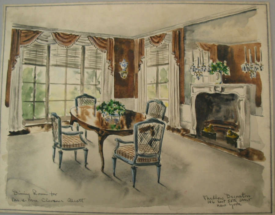 On recto in black ink: "Dining Room for / Mr. & Mrs. Clarence Alcott / Thedlow Decorators / 146 East 55th Street / New York".