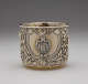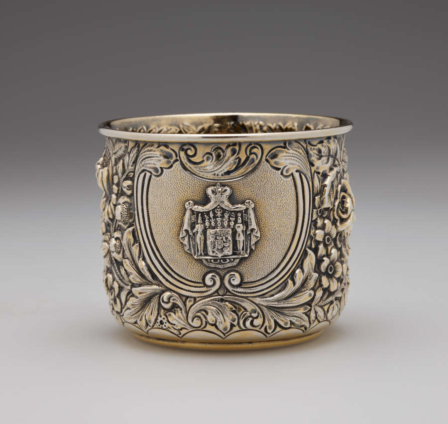 [Stamped on bottom] lion, anchor, G / STERLING / 3960 / stamped shell symbol (?). [Stamped on side of body] crest with banner underneath reading "FORTITUDINE ET CONSTANTIA."