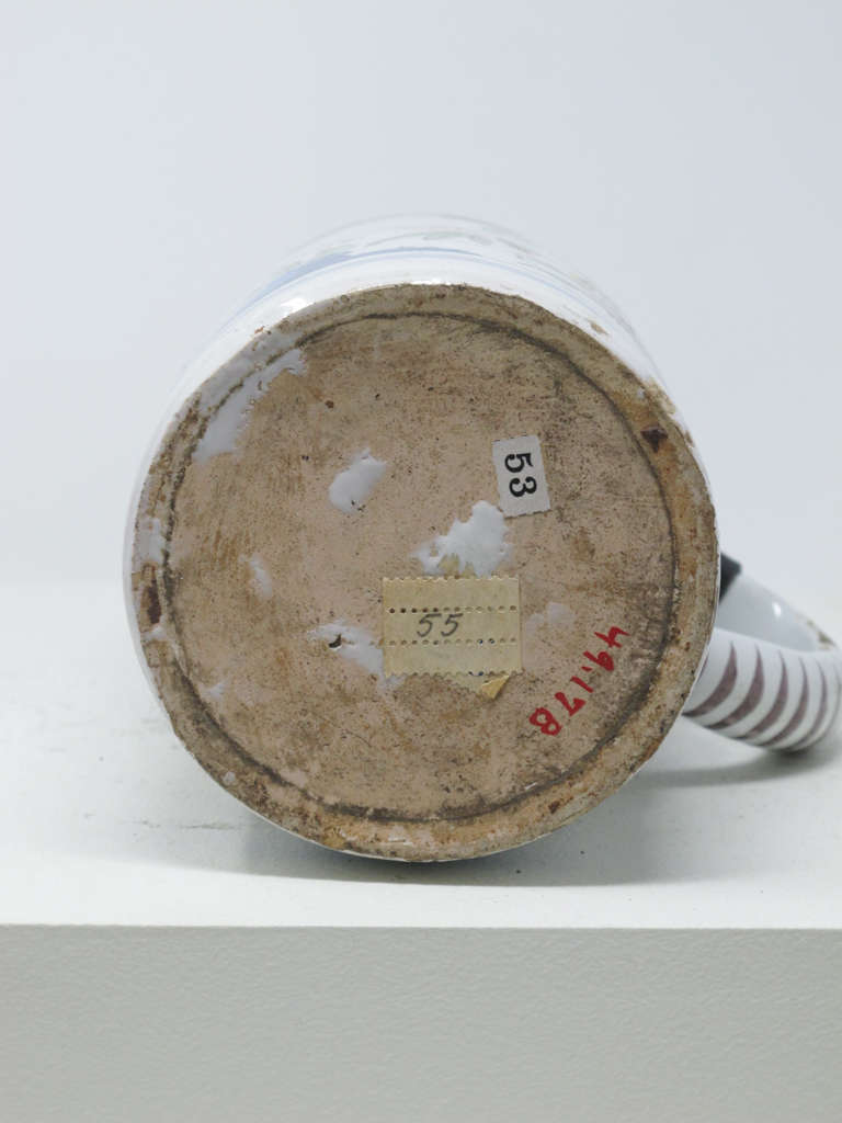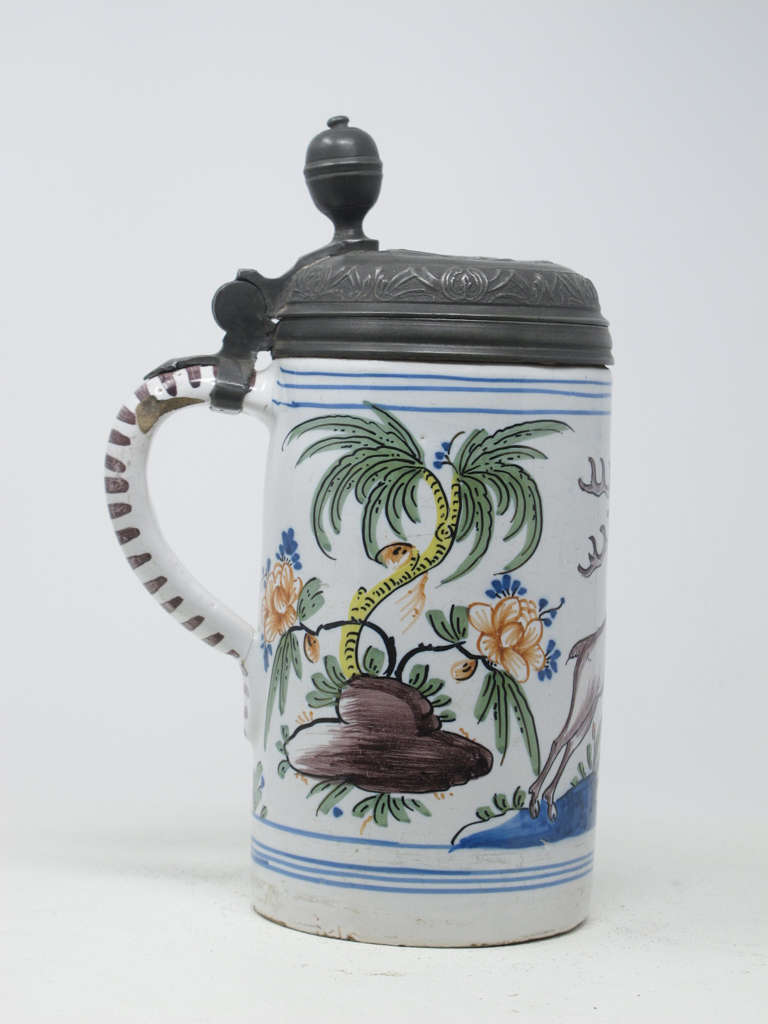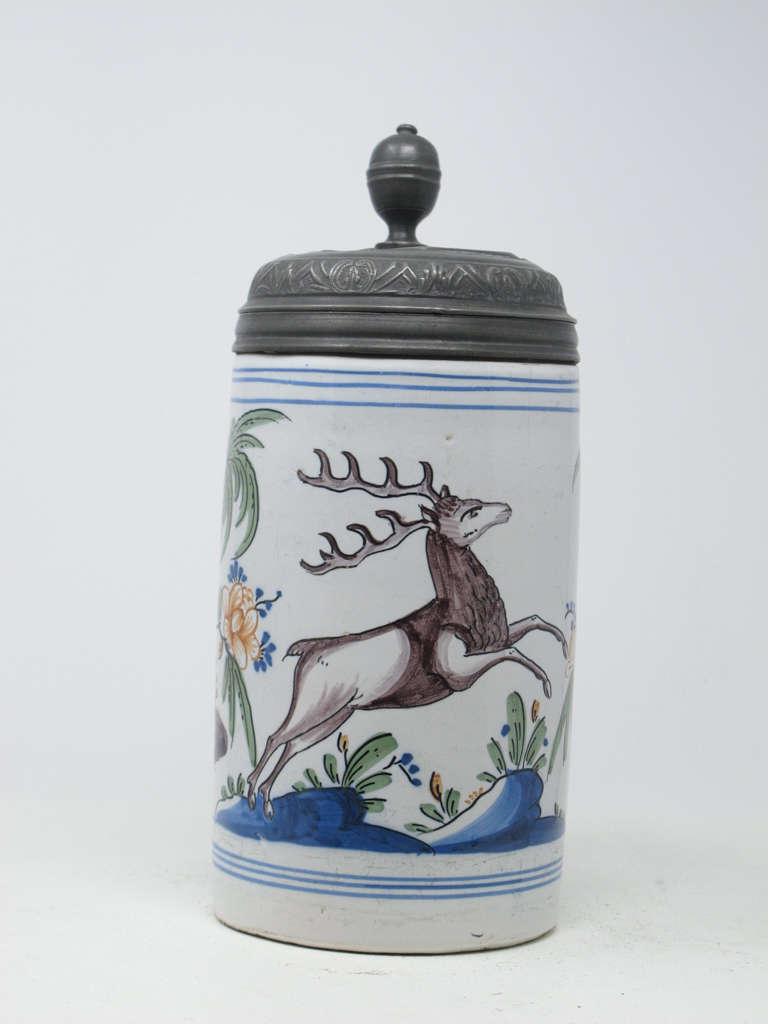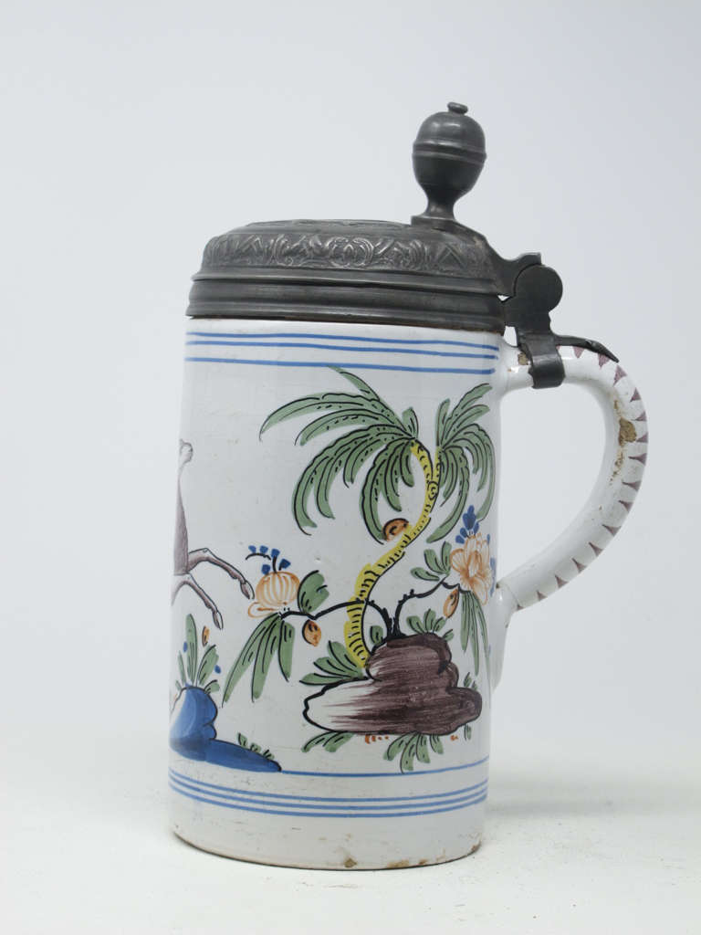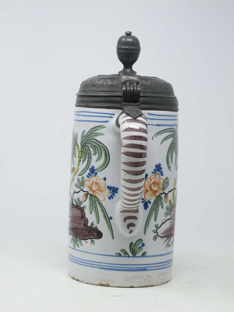 Tin-glazed earthenware, enamel decoration, pewter mounts