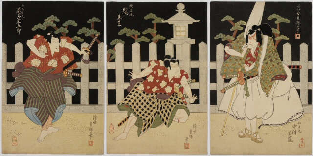 Nakamura Utaemon III as Matsuomaru, Arashi Raishi II as Umeomaru and Onoe Kikugoro III as Sakuramaruin the scene "Pulling the carriage apart' (Kuruma biki) from the play Sugawara's secrets of calligraphy (Sugawara denju tenarai kagami)