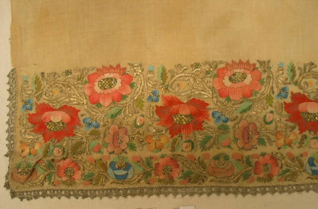 Cotton plain weave with silk- and metallic-yarn embroidery, trimmed with metallic needle lace