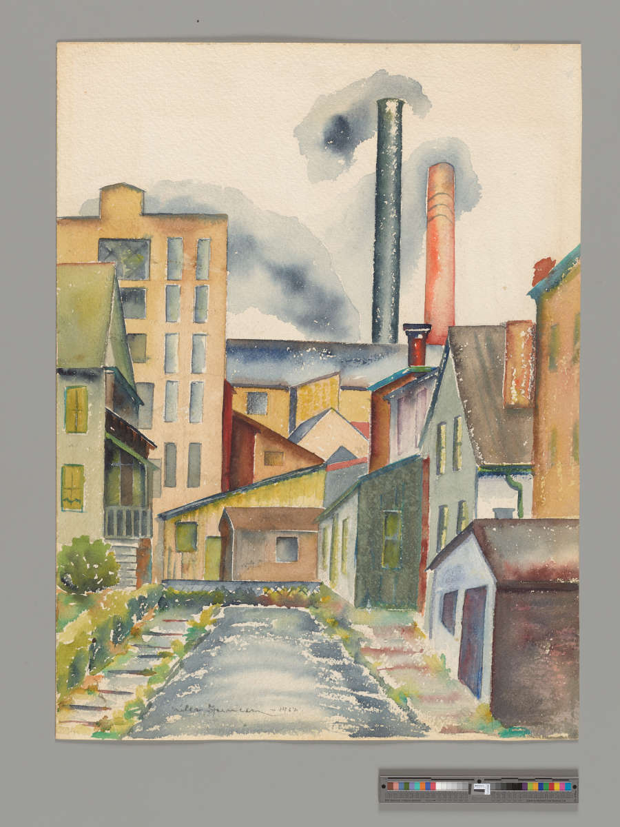 Written in ink on top center of frameback: 'Niles Spencer 1912 Prov. RI // Narragansett Power Plant -- Smoke Stacks in the distance' Credit / Object Number