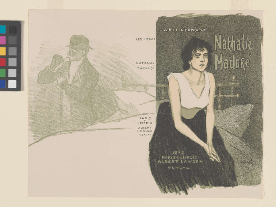 In Plate--Signed, LR:Steinlen; titled, UR:Nathalie/Madoré; above woman's head:ABEL HERMANT; on bottom of woman's dress:1895/PARIS & LEIPZIG/ALBERT LANGEN/VERLAG; down center of image:ABEL HERMANT/NATHALIE/MADORÉ/1895/PARIS/&/LEIPZIG /ALBERT/LANGEN/VERLAG