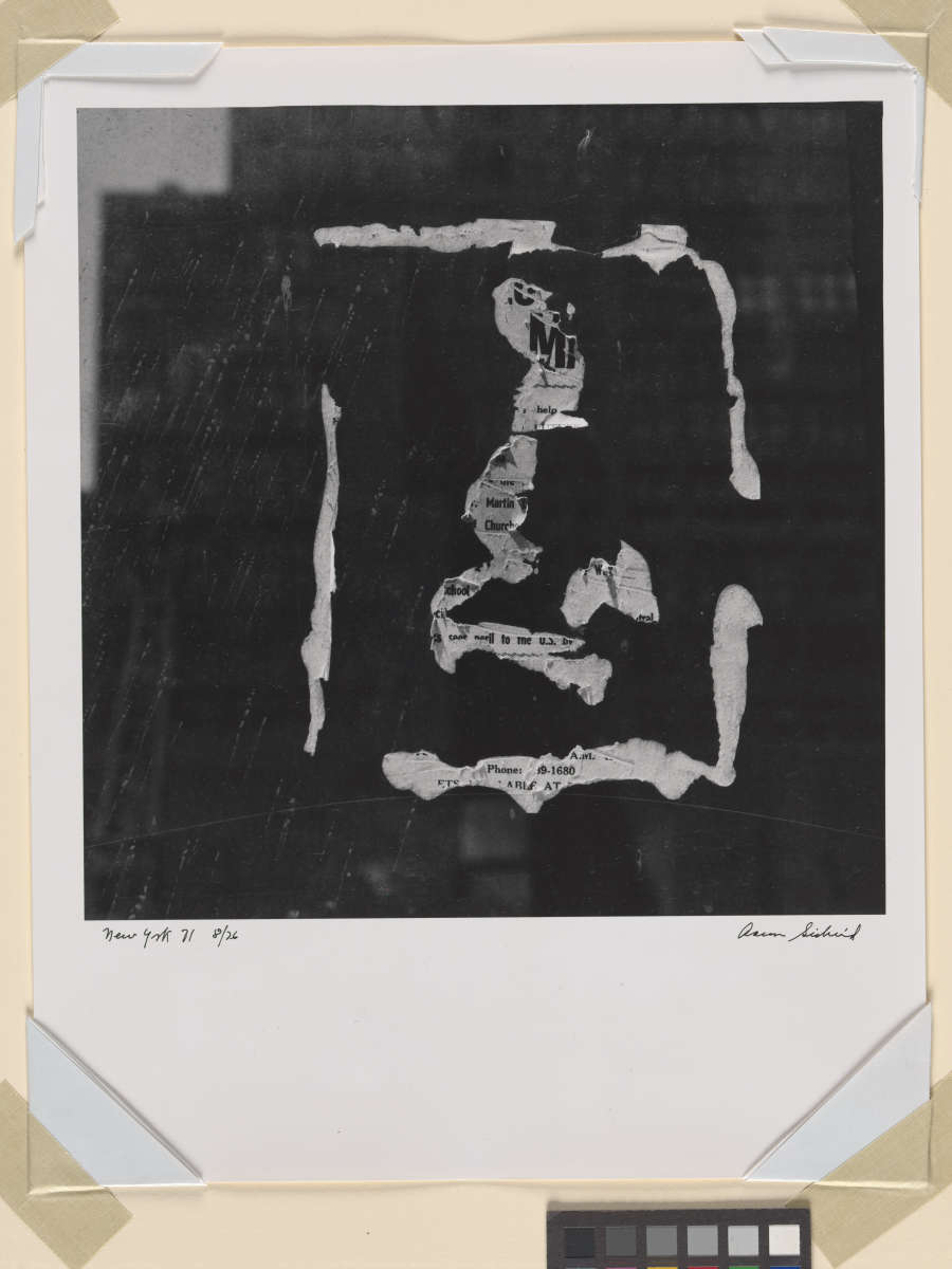 Singed in pen, LR:Aaron Siskind; inscribed in pen by artist, LL:New York 71 8 / 76; (verso) in pencil, bottom:NY 71 8 / 76 5