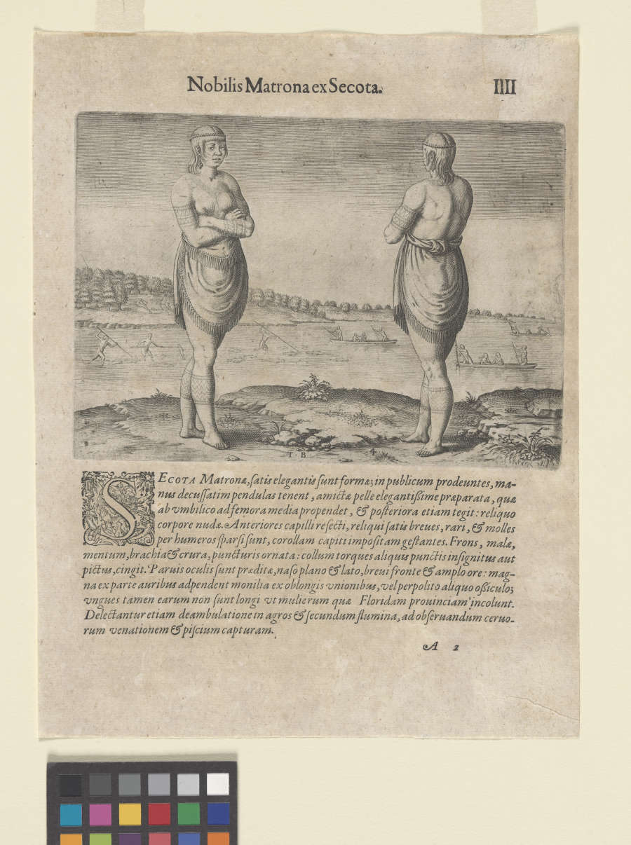 In Plate--Initialed and numbered in LC:T-B--4-In letterpress above image.Nobilis Matrona ex Secota. III; in letterpress below image, 11line Latin inscription:Secota Matronae, satis elegantis...(see print);in letterpress below image in LR:A 2