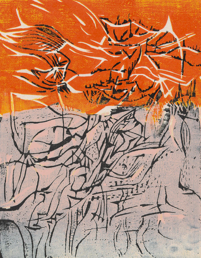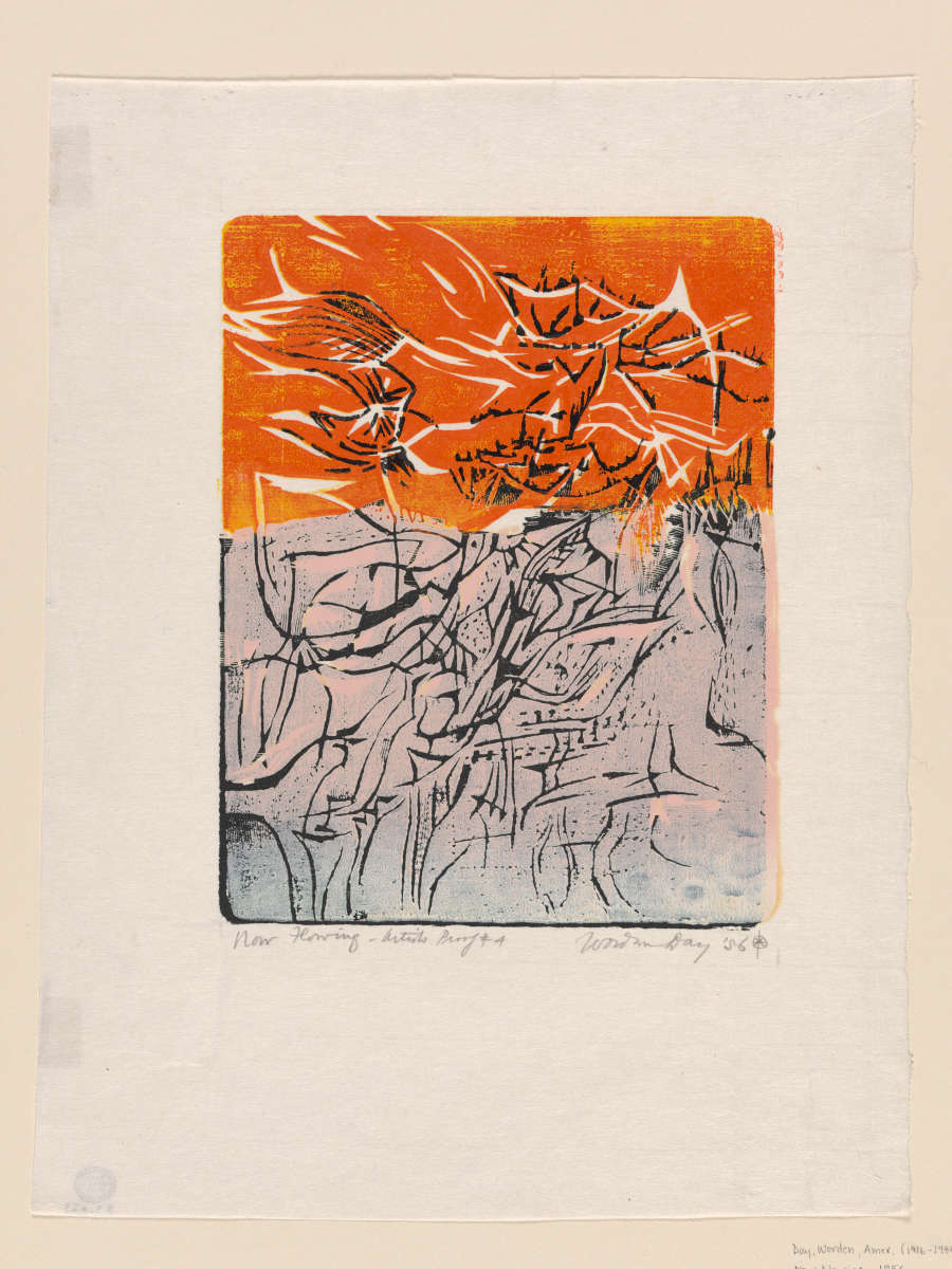 Original--Recto:Inscribed in pencil on left under image:Now Flowing - Artist's proof #4; signed on right:Worden Day ' 56 (artist's symbol)Verso:in LR corner in pencil:57.029