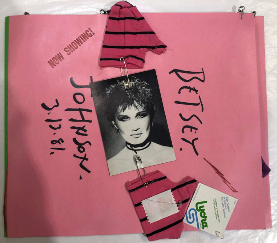 Inscriptions: Printed red ink on recto UL: “NOW SHOWING!”. Inscribed and signed in black ink on recto center: “BETSEY. / JOHNSON. / 3.13.81.”
