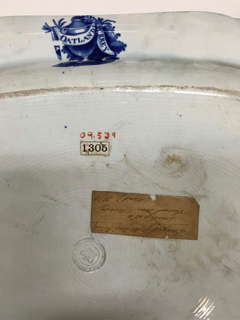Marks: On bottom printed in blue on riband draped over urn:Oatland Surrey; and stamped in circular form with crown in center:A. Stevenson warranted Staffordshire.