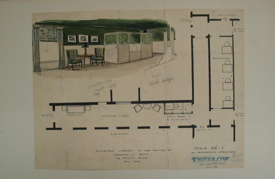 In pencil on recto: "Lyman Martin (signature) / Lottie Handy (also script) / ok / ? / ? rubber tile / ma(?)-roll / cork / Removable panel / OK check design / 32" 3'-0" 2'=6" " In ink on recto in printed block letters (read clockwise): "PRIVATE OFFICE / STENOGRAPHERS / PRIVATE OFFICE / STENOGRAPHERS / PRIVATE OFFICE / WAITING ROOM / SCALE 3/16"=1' / ALL MEASUREMENTS APPROXIMATE / SWITCH BOARD & RECEPTIONIST / SUGGESTED CHANGES IN THE OFFICES OF LEONARD J. BUCK / 74 TRINITY PLACE NEW YORK / ELEVATORS/ ENTRANE LOBBY (must be a misspelling of entrance) / NARROW GREEN LEATHER SOFA / OFFICES"